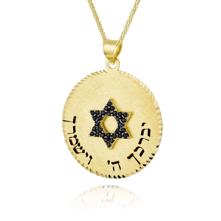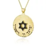 שרשרת ותליון בעיצוב מגן דוד מזהב 14K משובץ זרקונים שחורים וחריטת “יברכך ה’ וישמרך”